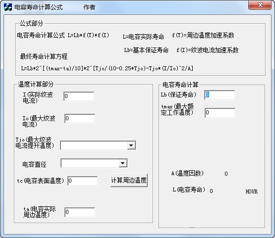 电解电容寿命计算软件官方版是一款体积小巧、便捷、好用的计算工具,电解电容寿命计算软件官方版主要是为了针对电容寿命进行计算的方程式软件,通过这款软件,用户可以快速的节约手算的时间,包括了对温度的计算部分、电容的直径等输入,即可快速的得出您的电容使用寿命。