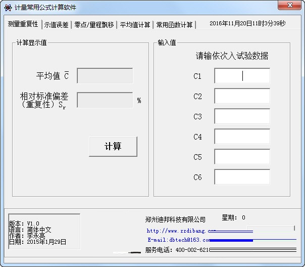 该软件提供了测量重复性、示值误差、零点/量程飘移、平均值计算、常用函数等计算功能