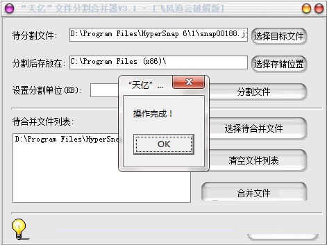 天亿文件分割合并器绿色版是一款操作步骤简单、十分专业的文件分割软件。天亿文件分割合并器绿色版支持分割各种类型的文件,能够将各种类型的文件分割成指定大小,给用户带来很多的便利,提高了办公的效率。