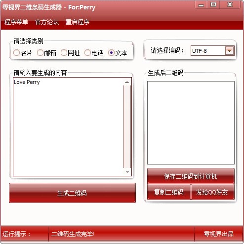 零视界二维条码生成器绿色版是一款高效的二维码的工具,零视界二维条码生成器绿色版可以生成名片二维码、邮箱二维码、网址二维码、电话二维码和文本二维码。现在二维码一直都很流行,很多地方都用上了二维码,那你自己也可以生成一个专属二维码,使用非常简单方便!