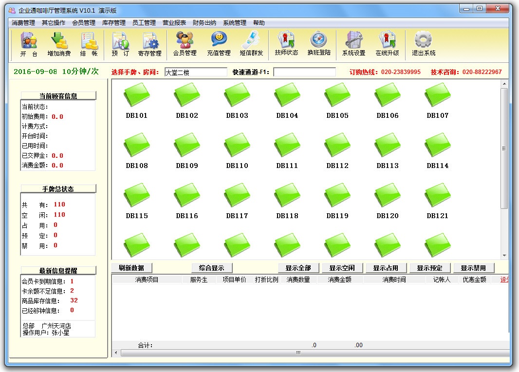 1、企业通咖啡厅管理系统官方版支持开台、增加消费、结账、预订等操作;
