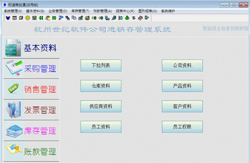 1、基本资料:包含产品资料、客户资料、供应商资料、仓库表、客户合同价,供应商合同价,员工表、员工权限等,基本资料是软件的基础部分,这里输入的内容在开单时被调用,初始化时产品资料、客户资料、供应商资料可以从excel文件中导入