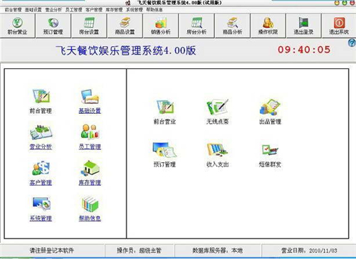 飞天酒吧管理软件官方版是一款功能完备、简单易用的酒吧餐饮管理软件,飞天酒吧管理软件官方版是餐饮娱乐企业进行电脑信息化管理的理想选择。实现了餐饮娱乐企业日常营运的全面自动管理,可广泛适用于各种规模的餐饮娱乐企业,如:餐厅、酒楼、歌舞厅、夜总会、桑拿、酒吧、咖啡厅、快餐店、综合娱乐场所等等。