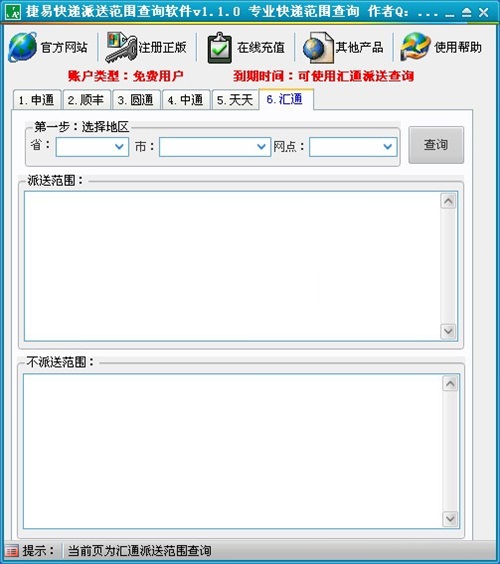 捷易快递派送范围查询软件官方版是一款界面简洁、适用范围广的快递查询软件,捷易快递派送范围查询软件官方版专门用于查询快递的派送范围。目前支持圆通,中通,天天等多家物流快递,一键查询快捷方便。免费用户无需注册即可使用汇通快递派送范围查询。