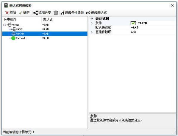 C单元引用A和B单元组成的公式,但不是简单的引用,当A大于某数时是一种公式,当A小于某数时换另外一种公式,在我们的软件中就可以用如下方式直观地实现:
