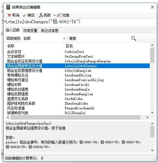 见上图,软件内置了一些幕墙计算常用的函数,方便幕墙工程师直接调用。另外要说明的一点是,虽然有的函数没在这里列出来,比如一些通用的三角函数sin(