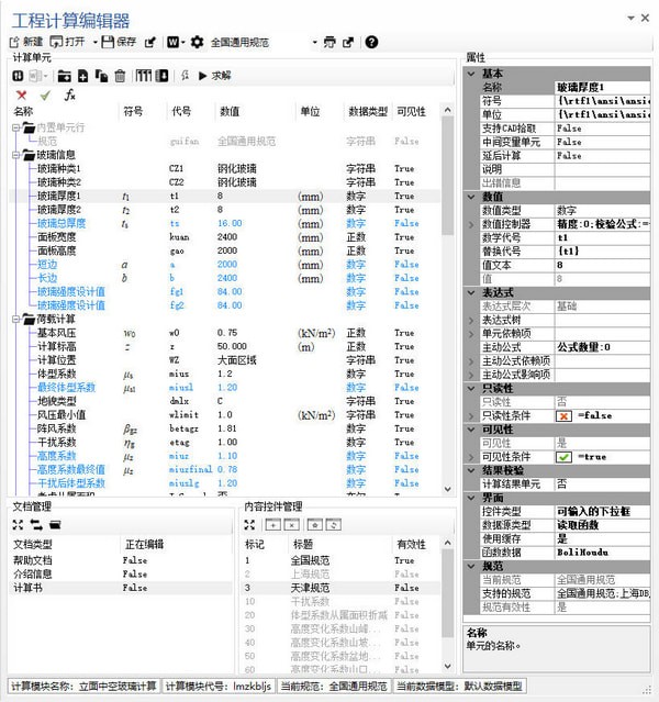 工程计算编辑器借鉴了Excel编写计算书的思路,一个计算模块由多个计算单元组成,计算单元之间可以互相引用,更新某个单元时相关联的计算单元全部更新。在借鉴的基础上,针对工程计算的特点,扩展了Excel所没有的功能,增强了Excel中比较弱的方面。例如:计算单元不但拥有代号,还可以拥有和规范书写方式一摸一样的数学符号和单位。公式不只是简单的线性公式,而是表达式树的方式,书写和维护更方便。计算书的输出非常灵活,可以根据各种逻辑生成不同分支的计算书内容。计算书的格式是标准的word格式,可以完全使用word内置的公式系统。