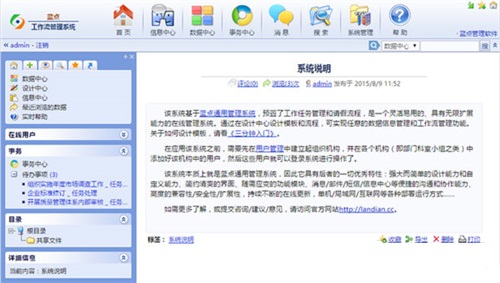2、蓝点工作流管理系统具有灵活简约的可视化流程设计,直观的流程状态展示,方便的事务提醒、通知和沟通,为企业或团队提供了一个精简高效的网络化工作平台。