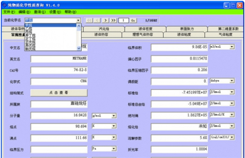 3、“查询”菜单是进行物性查询的界面,查询方式有“中文检索”、“英文检索”、“CAS检索”和“化学式检索”,也可进入查询界面后再选择查询方式,除“CAS检索”查询方式外,其他查询方式均可以浏览历史查询记录,通过点击下拉菜单完成;