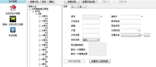 以小区为基本单位,以楼栋或街区为主干,以住宅、商铺、车位为基本单元,通过树状结构建立小区的物业资料库。包括住宅或商铺的详细信息,如单元号、面积、户型、交付时间、户主名称、户主电话,物业缴费标准,上次物业缴费时间,物业费到期时间、是否出租,承租人姓名、承租人联系电话