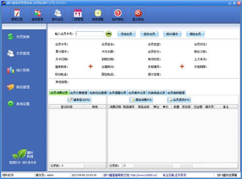 该功能可以对会员刷卡登记和会员消费店内商品进行管理。同时也可以管理兑换商品、充值、私教。