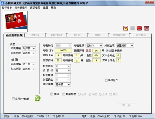 由于地区,时间,及市场环境的不同,在计价实际工作中同一个产品会发生一些不同的差异,所以我们在发挥软件计价的高度自动化的同时,还为你提供极大的灵活性,也就是说替你计算,由你修改,举个例子说,当你要计算一个包装产品,在输入了基本参数后,他会把该产品所涉及到的所有材料,加工项目,赋税,管理等全部分门别类像您在纸上列清单一样,全部列出,一目了然,(我们在手工计价中有时不免会遗漏某些项目),面对这样一个清晰的印价清单,您不必担心某个项目被遗忘,也不必担心某个数字不准确,不准确你随时可以修改,数量、单价全部可以改,你只要面对清单轻松地审慎或增或减而已。不管你是增还是减,最后的工价总是立即显示。