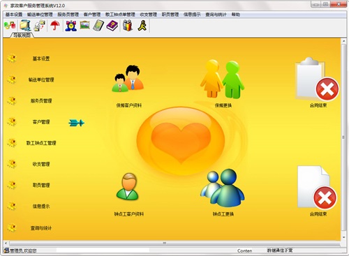 九、查询与统计:客户合同签约数统计,输送费统计,服务员输送单位统计。