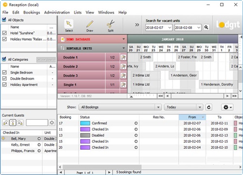 6、Lodgit Desk使得管理住宿在酒店,宾馆,度假公寓,露营场地,或青年旅社轻松了许多。使用图形化的预约日程,Lodgit
