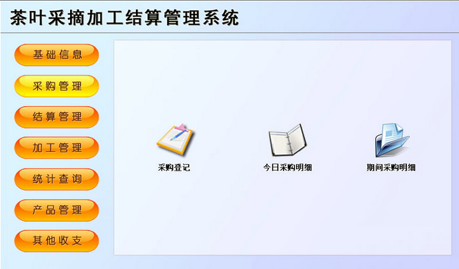 二、采购管理:采购登记、今日采购明细、期间采购明细