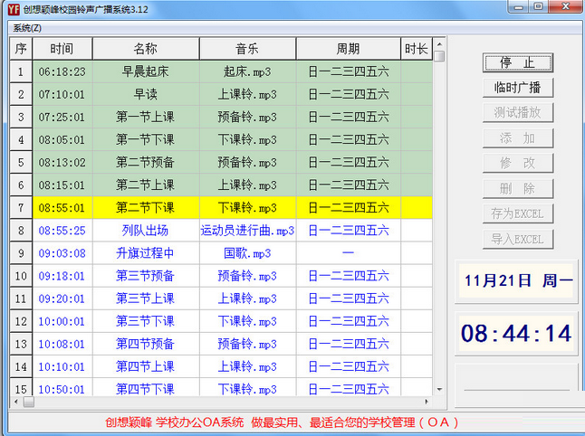 创想颖峰校园铃声广播系统最新版是专门用于对学校播放铃声使用的专业工具。创想颖峰校园铃声广播系统最新版可以自己设置时间、还有打铃的顺序都可做到很好的操作。