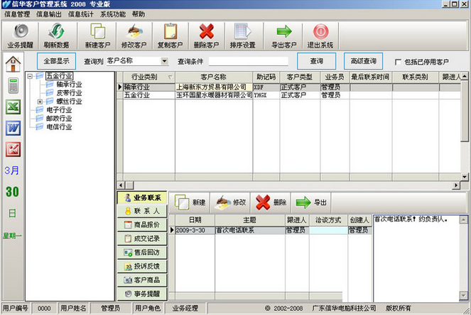 1、界面按行业(地域)分类、客户基本资料、客户详细业务跟踪划分为三大块,操作简单明了。