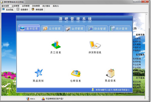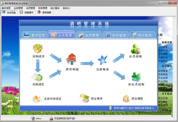 2、业务管理:采购进货、采购退货、库存明细、本店可供项目、当前账单、收银结账(会员结账、非会员结账)、吧台寄存、吧台提取、缺货提醒、超储提醒。