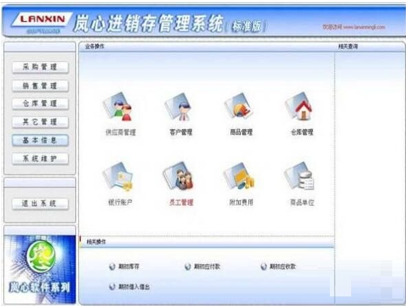 岚心进销存管理系统免费版是由民间周易预测中心――岚心命理为宣传自己产品免费的一款综合型的进销存管理软件,其中包括采购管理,销售管理,仓库管理,报表管理,基本信息管理,系统管理等子模块。实现了对企业物流、资金流、信息流的过程式管理与控制,其图形化操作、导航式界面依然延续着岚心系列软件的传统特色,为众多用户提供了直观而快捷的操作模式。软件界面设计简洁、美观、人性化的操作流程,使普通用户不需培训也能很快掌握软件操作使用方法。对计算机配置要求低,广泛适用于公司企业、商场、超市、门店等。