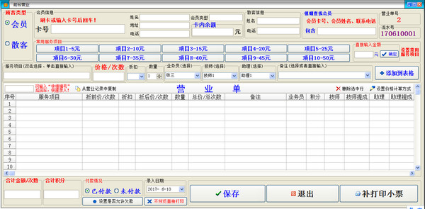 12:简单明了的前台营业录入界面,前台营业服务项目的服务价格计算可以设置为:1、正常计算;2、直接削去小数;3、四舍五入,削去小数。默认是正常计算,可以根据自己实际情况设置服务价格计算方式。前台营业录入的时候可以选择录入数量。收件的时候支持输入服务项目快捷编号快速录入。可以设置十个“常用服务项目”,这样,常用的服务项目(比如剪发-20元)一点鼠标就完成了。该界面一目了然,该界面可实现自动区分会员和散客,会员自动刷卡扣钱(扣次数),散客需要收取现金;同时,系统支持顾客欠款,可以在“欠款统一结账”界面统一补收。系统自动根据您的设置给会员计算增加积分。录入后,可以打印小票,也可以通过控制,不打印小票,功能比较灵活;可以对会员自动发送消费提醒短信。