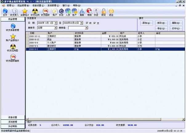 2、收支管理:记录公司的日常收支记录,并可自动计算所有帐户的余额或单独某一帐户的余额