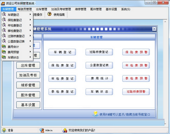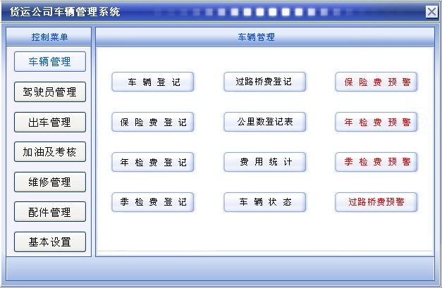 1、车辆管理:车辆登记,车检、保险登记,过路费登记,公里数登记,车辆实时状态,车辆各类各类费用预警,支出费用统计。