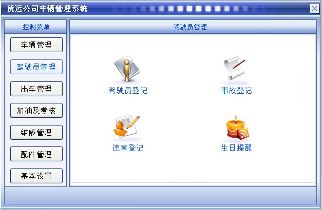 2、驾驶员管理:驾驶员登记,各类交通事故登记,车辆违章登记,以及更加人性化的员工生日提醒。
