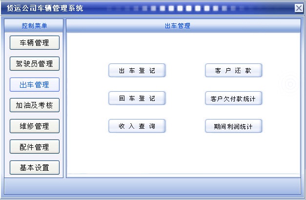 3、出车管理:车辆出入登记,收入查询,客户还款,客户欠款统计,期间所获例如统计。
