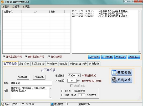 客户机开机自动发送、定时发送、手动发送。其中有右下角公告、滚动公告、状态栏气泡、信息框、网址。