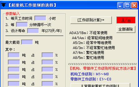 ??起重机工作级别选择工具是款功能全面的起重机工作级别软件,其软件将您已知的数值进行输入,点击工作级别的计算按钮,就能得到你需要使用的起重机工作级别,非常方便实用。