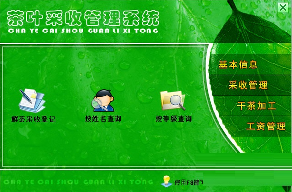 2、采收管理:鲜茶采收登记、按姓名查询、按等级查询。