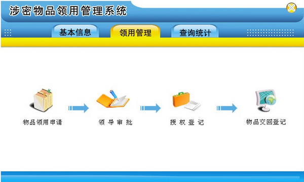 2、领用管理:物品领用申请、领导审批、授权登记、物品交回登记。