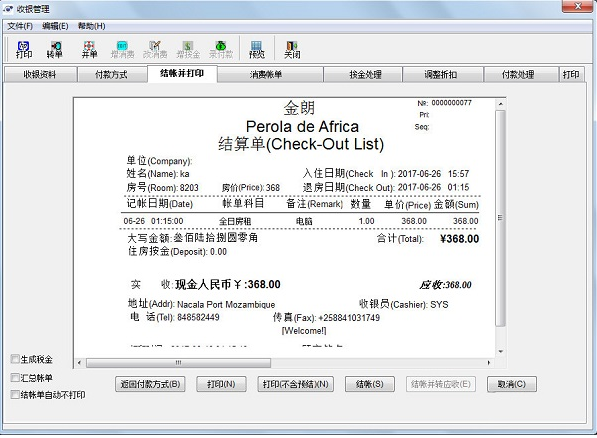 6、 结帐处理:可灵活处理单项结算、退房离店结算、团体结算、挂帐处理、帐号冻结等处理;