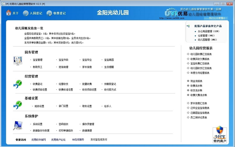 优易幼儿园经营管理软件可以帮助我们对幼儿园的管理很详细。优易幼儿园经营管理软件优秀的易用性及清新的界面风格致力于打造中国第一数字化幼儿园管理软件。