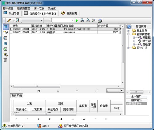 2、差旅费用管理:差旅费用登记,财务审批,总经理审批