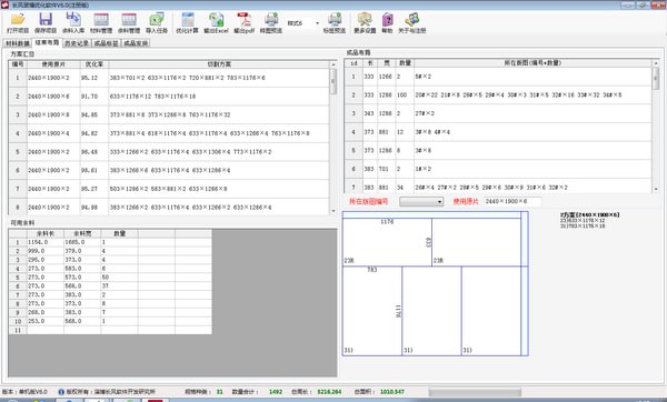 ??可实现多种不同规格的原片参与优化,也可限制单种原片的数量,在优化过程中,当库存原片数量不足时,系统会取消使用该原片进行优化排版;同时支持多种成品(最多500种)和多种板材原片同时进行排版优化,以得到更高的优化率。