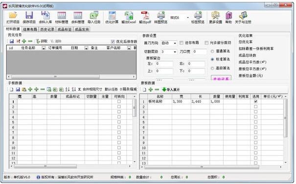中批量导入导出或复制粘贴,还可自动合并相同尺寸,按升降排序,选取原片可直接从库存中调入优化,优化结束后,软件可自动计算余量(本次计算结果中因原片数量不足,成品剩余未切割的数量)。