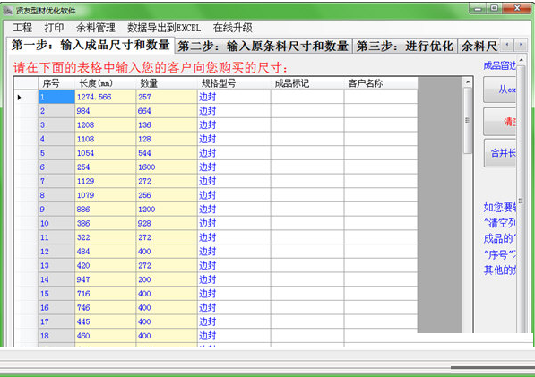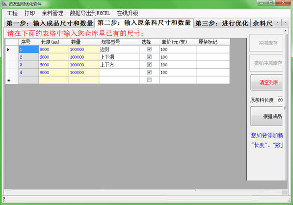 型材Excel导入和复制粘贴功能,方便下料尺寸的输入。