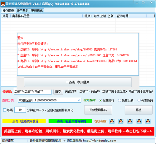 美丽说排名查询助手官方版操作简单,界面简洁。软件的使用相当的简单,界面美观大方。是一款能够轻松查询商品的排名和分布情况的查询软件,有效的帮助大家提升自己的商品的排名。