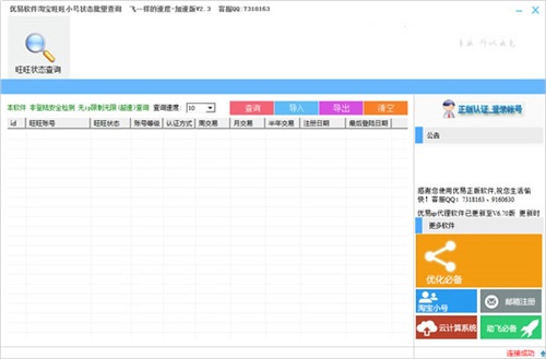 优易淘宝小号状态查询官方版界面美观实用,轻量快速,功能强大。可以很好地解决您的问题。速度快,无假死现象出现。针对目前查询乱象,甚至有部分小号因查询软件的错误而批量死亡,优易特推出淘宝小号批量查询软件,可以查询淘宝小号状态,信誉,注册时间等。