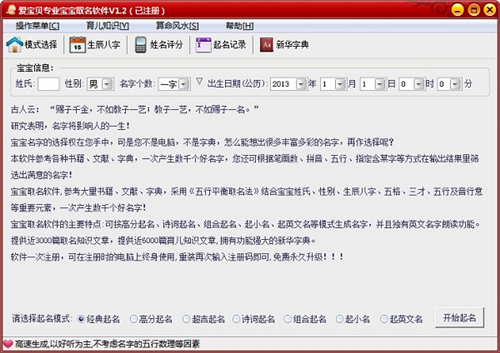 爱宝贝起名软件官方版拥有十分简洁的界面,运行速度也非常的快。多类型丰富功能任你使用。是一款十分专业的为了刚出生的婴儿取名的强大起名软件,这款爱宝贝取名软件可以让你根据出生时间,出生年月的详细信息来给自己的宝宝取名。可以使用软件上的筛选功能,筛选出适合自己孩子的名字,体验自己起名、自己做大师的乐趣!