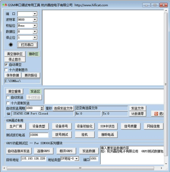 GSM串口调试助手是一个GSM短信模块串口调试工具。可以调试tc35,tc35i等模块,可以发信息,可以将Unicode代码转换为信息源码,非常使用方便的一个软件!支持常用的300-115200bps波特率,能设置校验、数据位和停止位,能以ASCII码或十六进制接收或发送任何数据或字符(包括中文),可以任意设定自动发送周期,并能将接收数据保存成文本文件,能发送任意大小的文本文件。