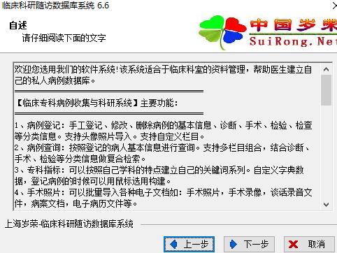 临床科研随访数据库系统是一款数据库管理工具,功能丰富,拥有病例登记,病例查询,专科指标,手术照片,康复评估,出院随访等功能,使用起来简单便捷。