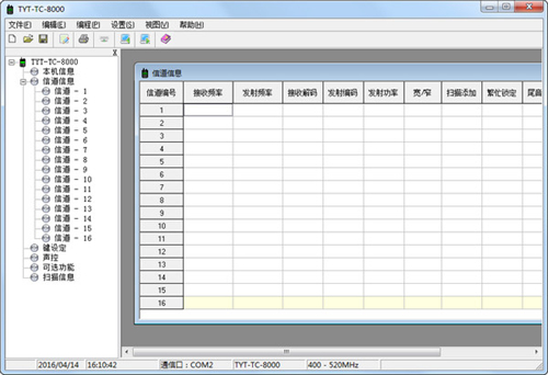 特易通tyt f8写频软件官方版是一款小巧轻量,速度飞快的写频软件。它灵活自由,简单直观。软件布局简洁,功能明晰,简单易用。主要适应于TYT-TH UVF8系列型对讲机使用。下载后将电脑与对讲机连接就可以对收频率、发射频率、解码、编码、发射功率、扫描添加、宽/窄、信道名、繁忙锁定、PTT ID、声控等参数进行修改了。