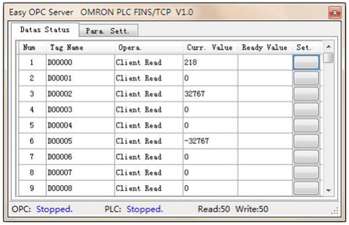 5、系统在运行过程中不能设置参数,可点Stop按钮停止运行后进行相关设置。参数设置完后点Start按钮,启动运行,通过数据状态页面可监控PLC的数点Hide按钮,可隐藏窗体,返回到系统托盘运行。