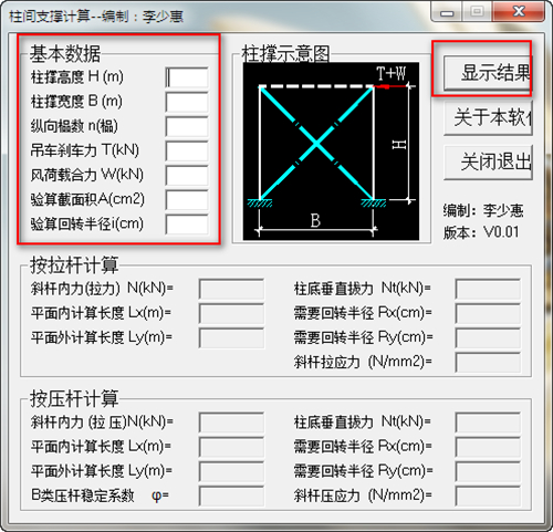 输入柱撑高度、柱撑宽度等数据,点击显示结果即可