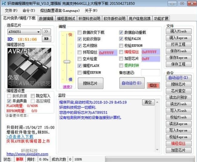 第二:不可预知的因素.这个主要是因为接触不良而造成的传输误码被芯片识别为了写熔丝的指令,从而误写熔丝。这个情况可能行成第一,二,三种锁定或不锁定.这个出现的概率不大.但一旦出现,应立马停止用新的芯片测试.要立马检查编程器与目标板的电气连接.重启软件.重连编程器.确定OK后再进行烧写.此原因造成的第一,三种情况,我们的编程器无法化解.