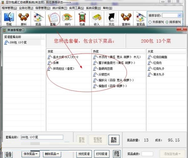 ??亚尔包桌汇总结算系统官方版可以自动计算原料购买量,自动分类汇总,自由打印采购清单
