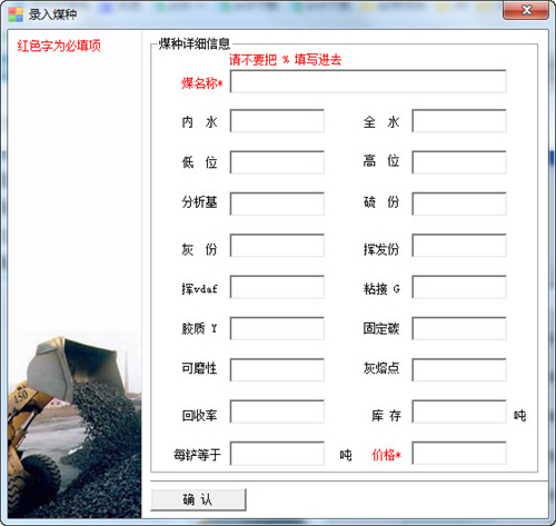 4、按照如图所示填写各项指标数据,注意不要把“%”填写进去,煤名称、价格这样的红色字体为必须填写的项目,填写完毕后请点击确定即可录入完一种煤。