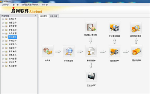 3、配送管理:分店可以手动、自动生成补货申请,总部自动配送,并把不能满足的自动生成采购订单,采购入库后再自动配送,连贯操作。